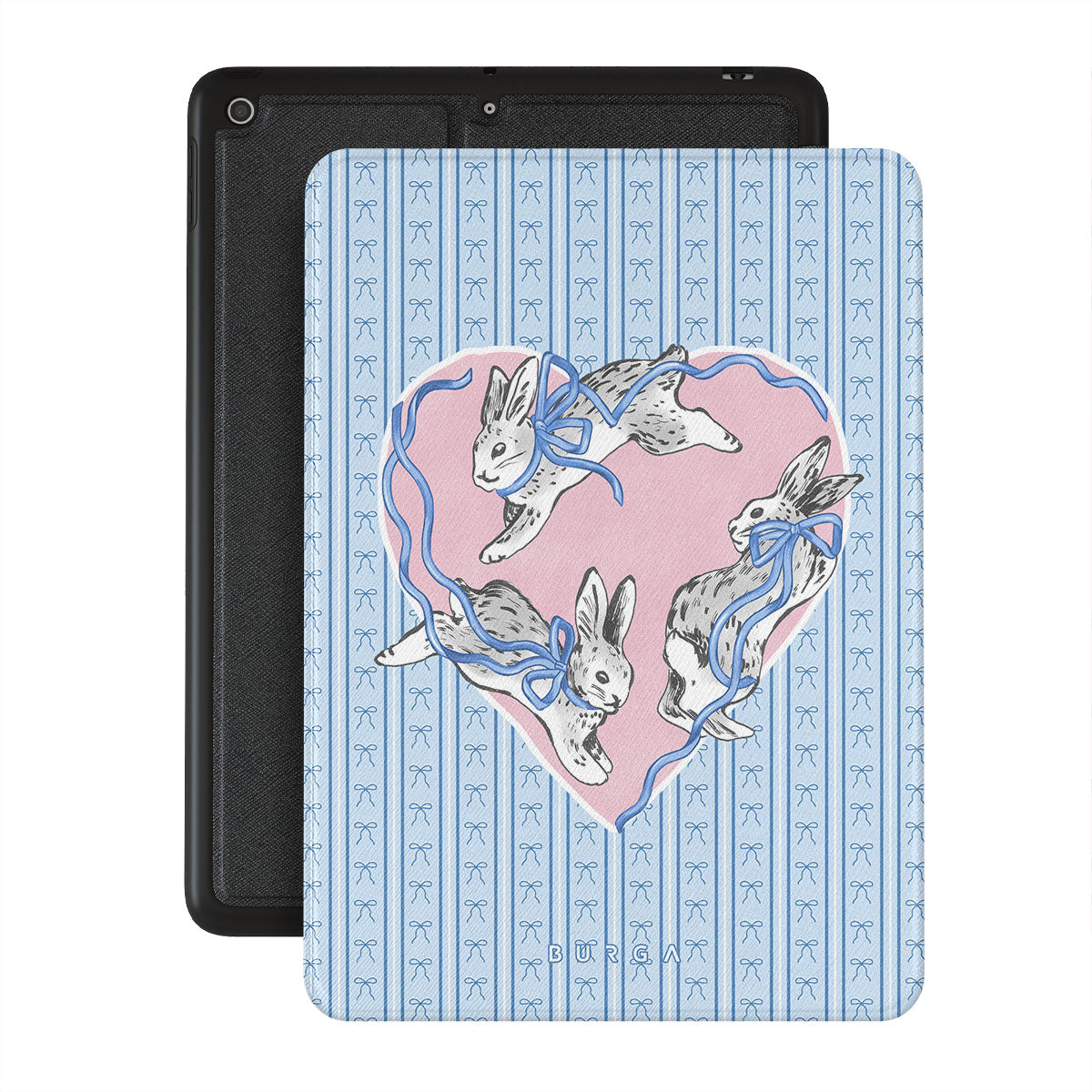 Główne elementy projektu: białe króliki, ramka w kształcie serca, niebieskie paski