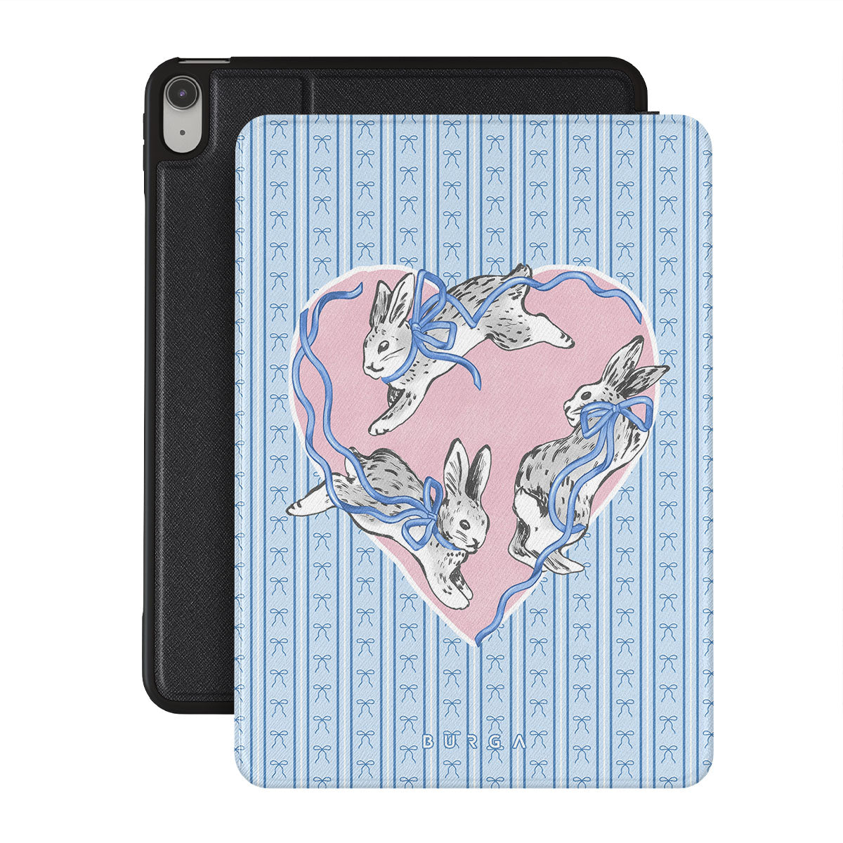 Główne elementy projektu: białe króliki, ramka w kształcie serca, niebieskie paski