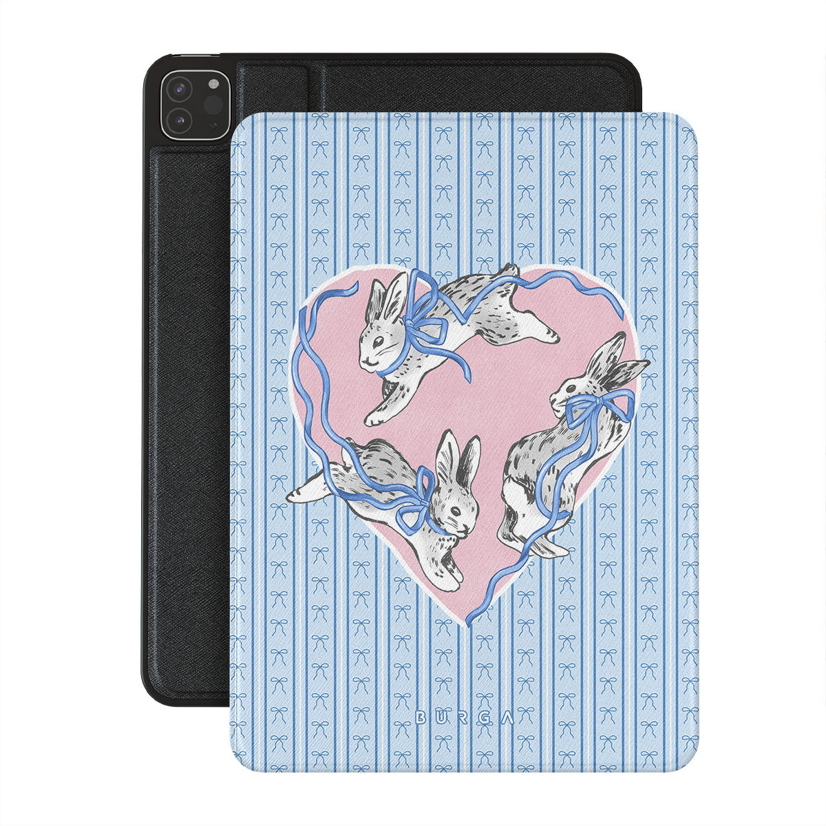Główne elementy projektu: białe króliki, ramka w kształcie serca, niebieskie paski