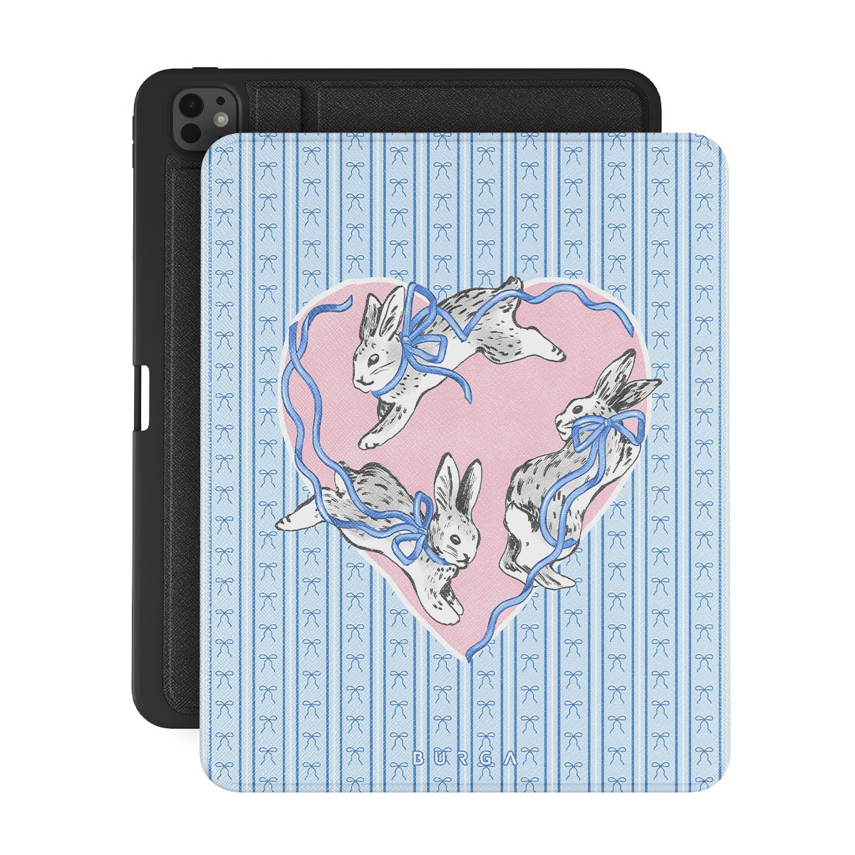 Główne elementy projektu: białe króliki, ramka w kształcie serca, niebieskie paski