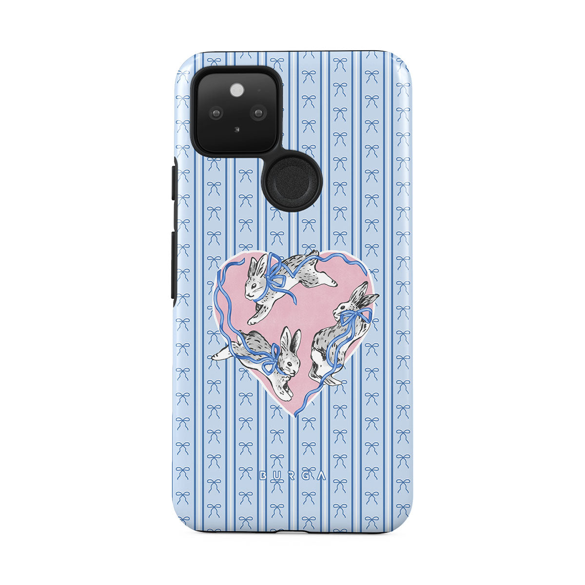 Główne elementy projektu: białe króliki, ramka w kształcie serca, niebieskie paski