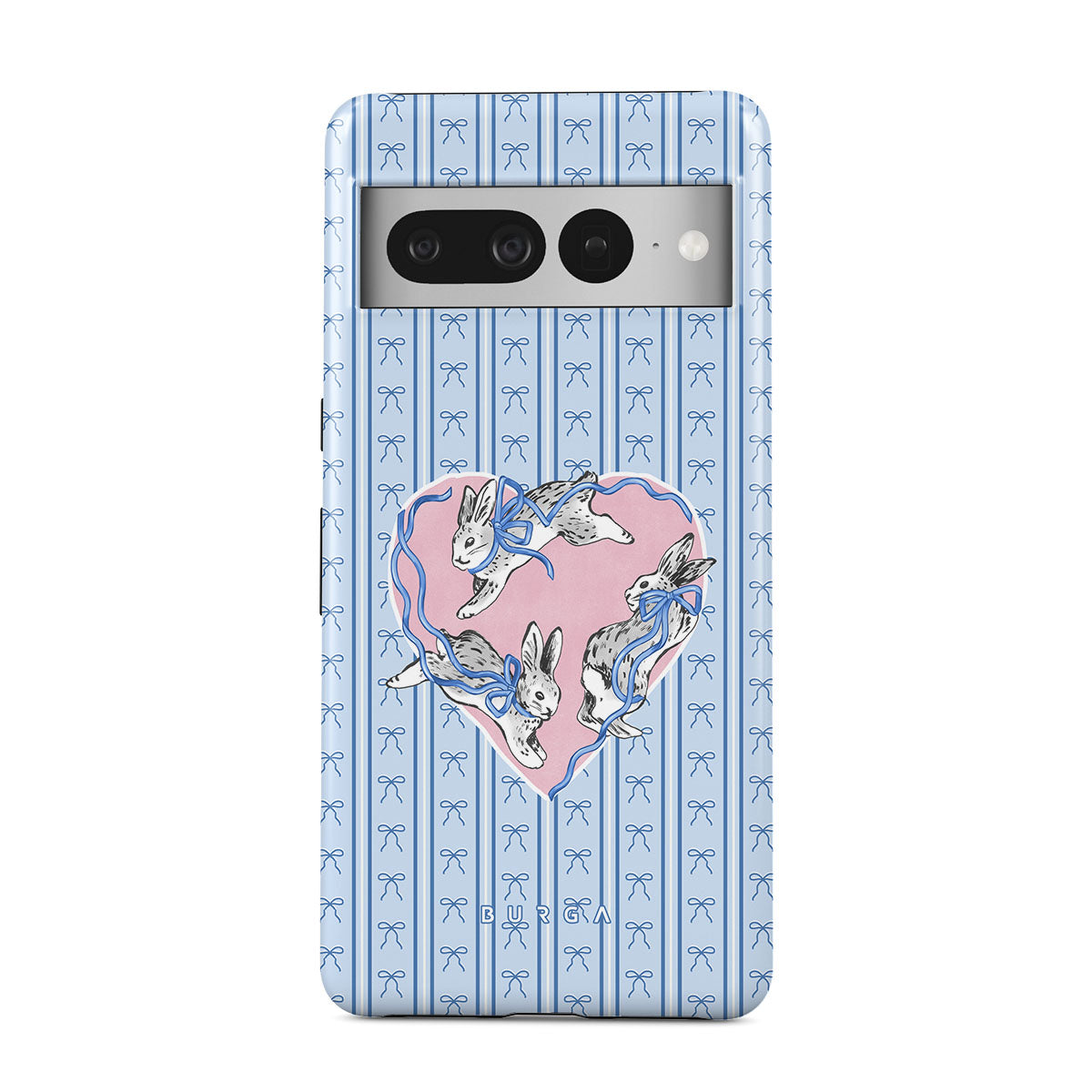 Główne elementy projektu: białe króliki, ramka w kształcie serca, niebieskie paski
