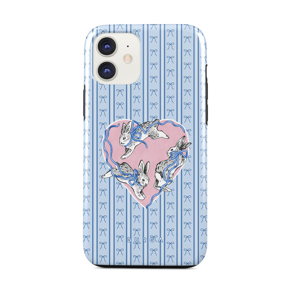 Główne elementy projektu: białe króliki, ramka w kształcie serca, niebieskie paski