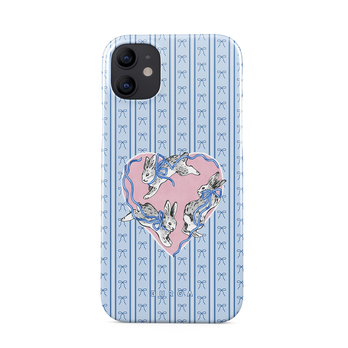 Główne elementy projektu: białe króliki, ramka w kształcie serca, niebieskie paski