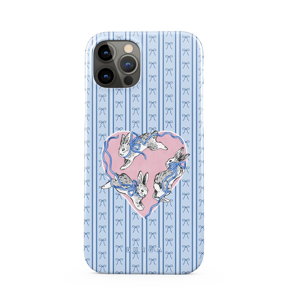 Główne elementy projektu: białe króliki, ramka w kształcie serca, niebieskie paski