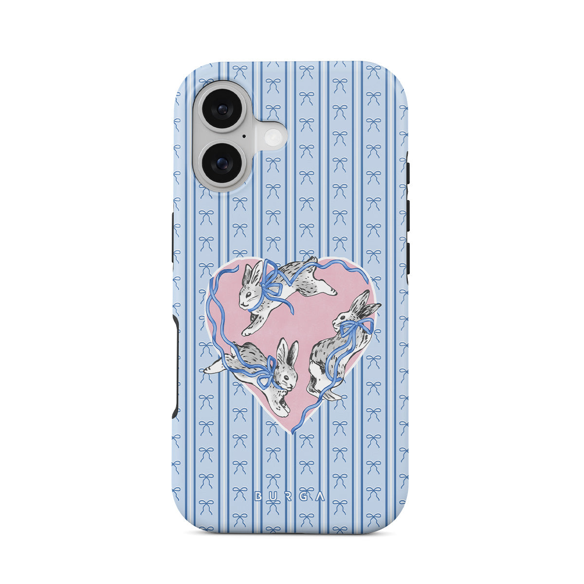 Główne elementy projektu: białe króliki, ramka w kształcie serca, niebieskie paski