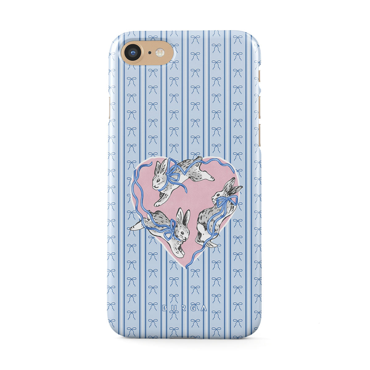Główne elementy projektu: białe króliki, ramka w kształcie serca, niebieskie paski