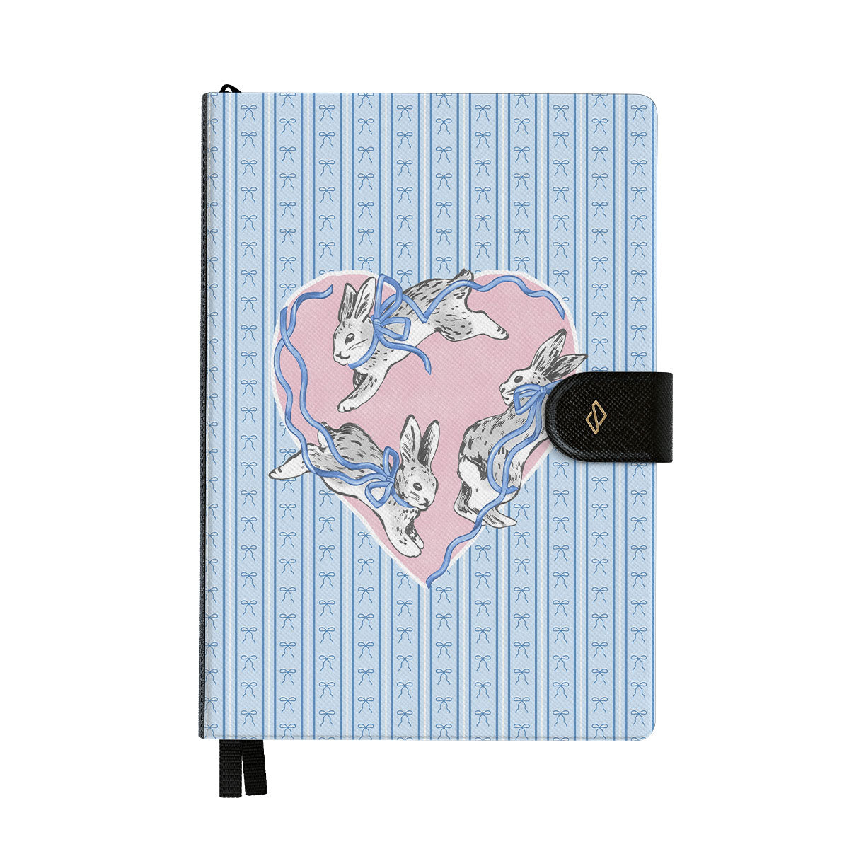 Główne elementy projektu: białe króliki, ramka w kształcie serca, niebieskie paski