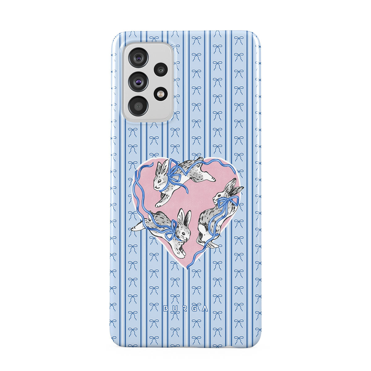Główne elementy projektu: białe króliki, ramka w kształcie serca, niebieskie paski
