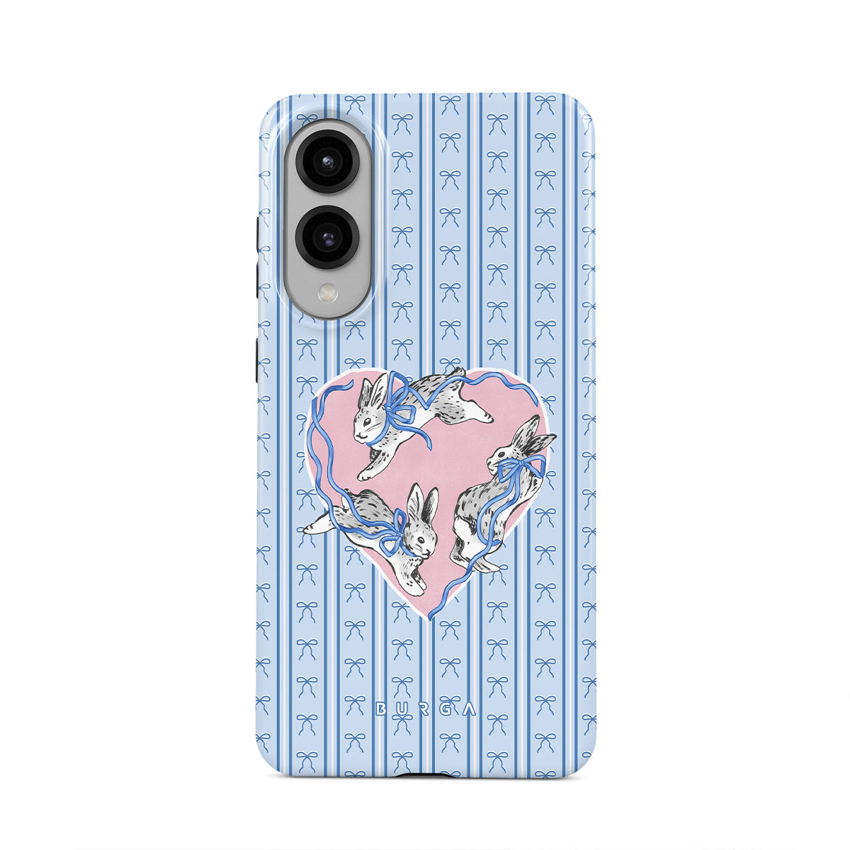 Główne elementy projektu: białe króliki, ramka w kształcie serca, niebieskie paski