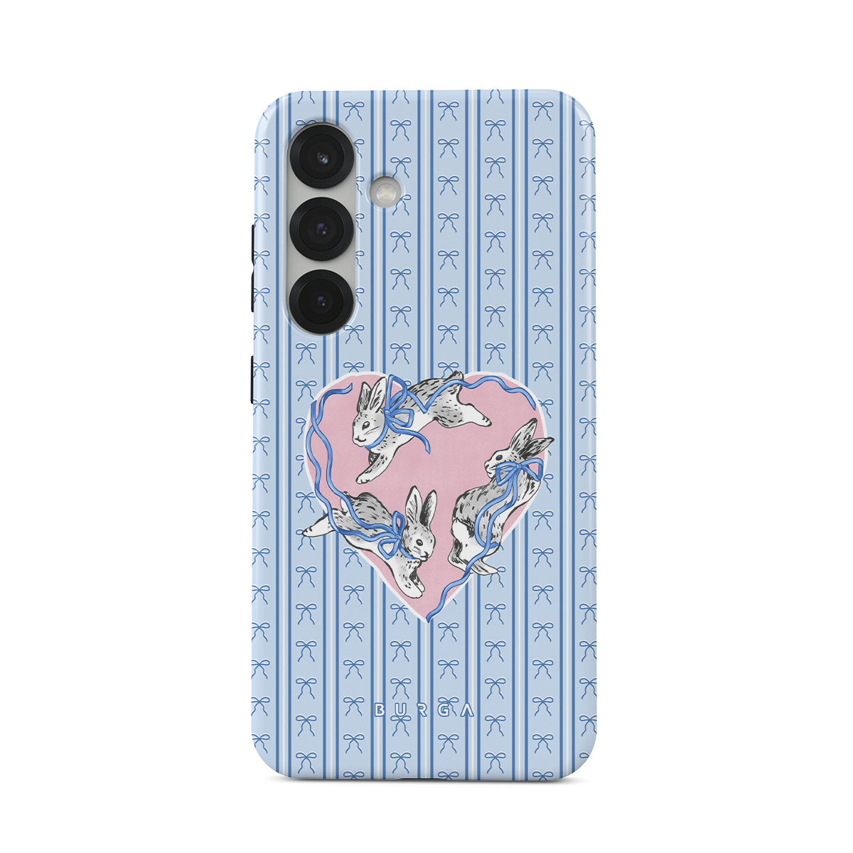 Główne elementy projektu: białe króliki, ramka w kształcie serca, niebieskie paski