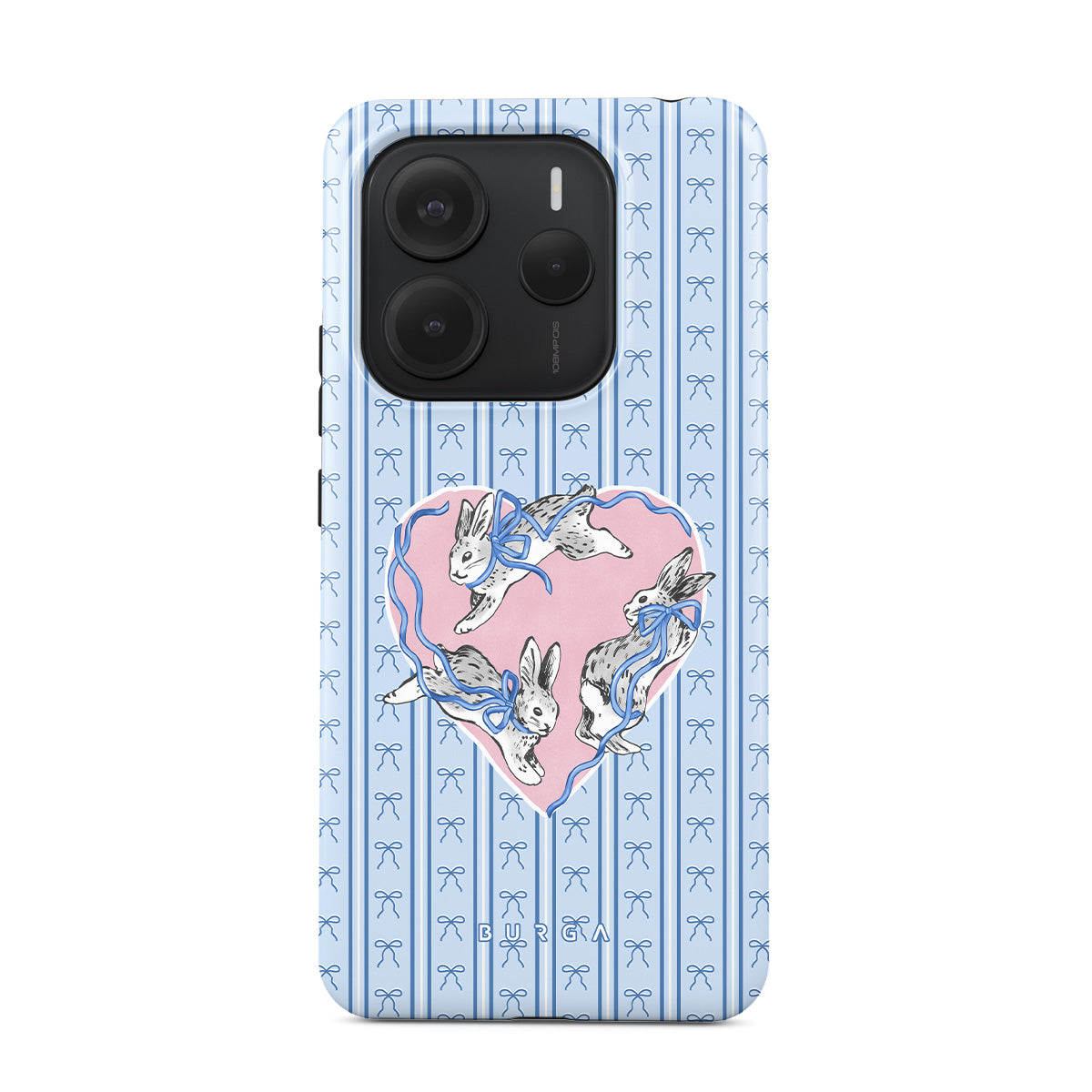Główne elementy projektu: białe króliki, ramka w kształcie serca, niebieskie paski