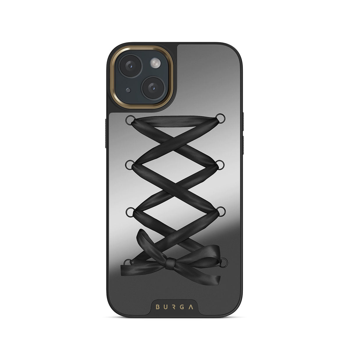 Główne elementy projektu: czarna wstążka, wzór krzyżujących się linii, lustrzane wykończenie.
