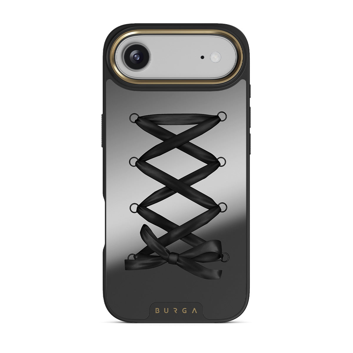 Główne elementy projektu: czarna wstążka, wzór krzyżujących się linii, lustrzane wykończenie.