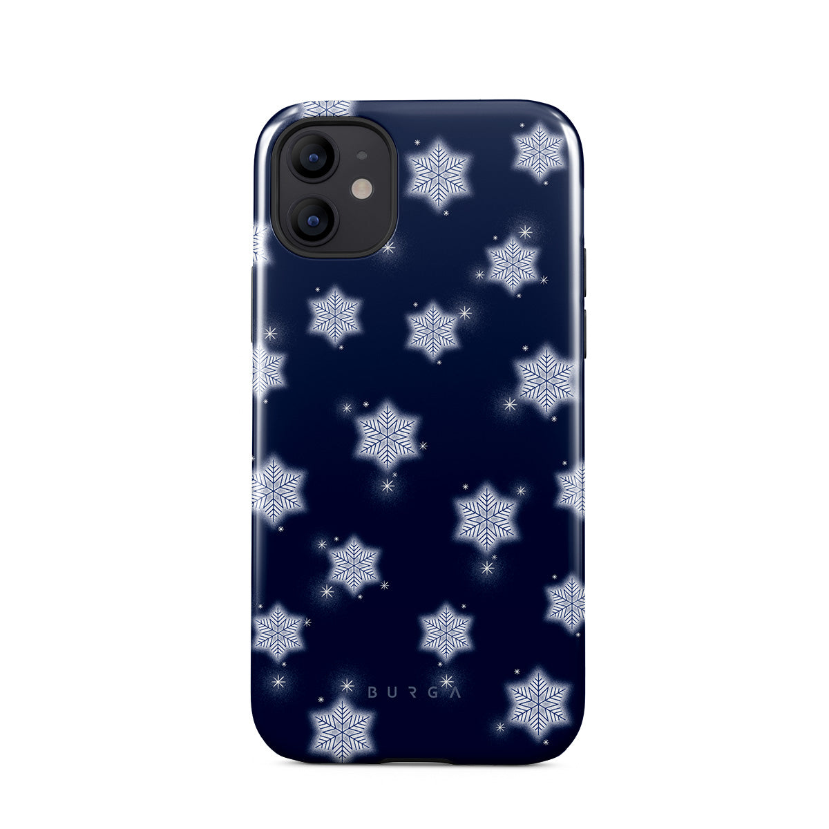 Główne elementy projektu: białe płatki śniegu, granatowe tło, zimowy wzór płatków śniegu, geometryczne płatki śniegu, klasyczny zimowy design