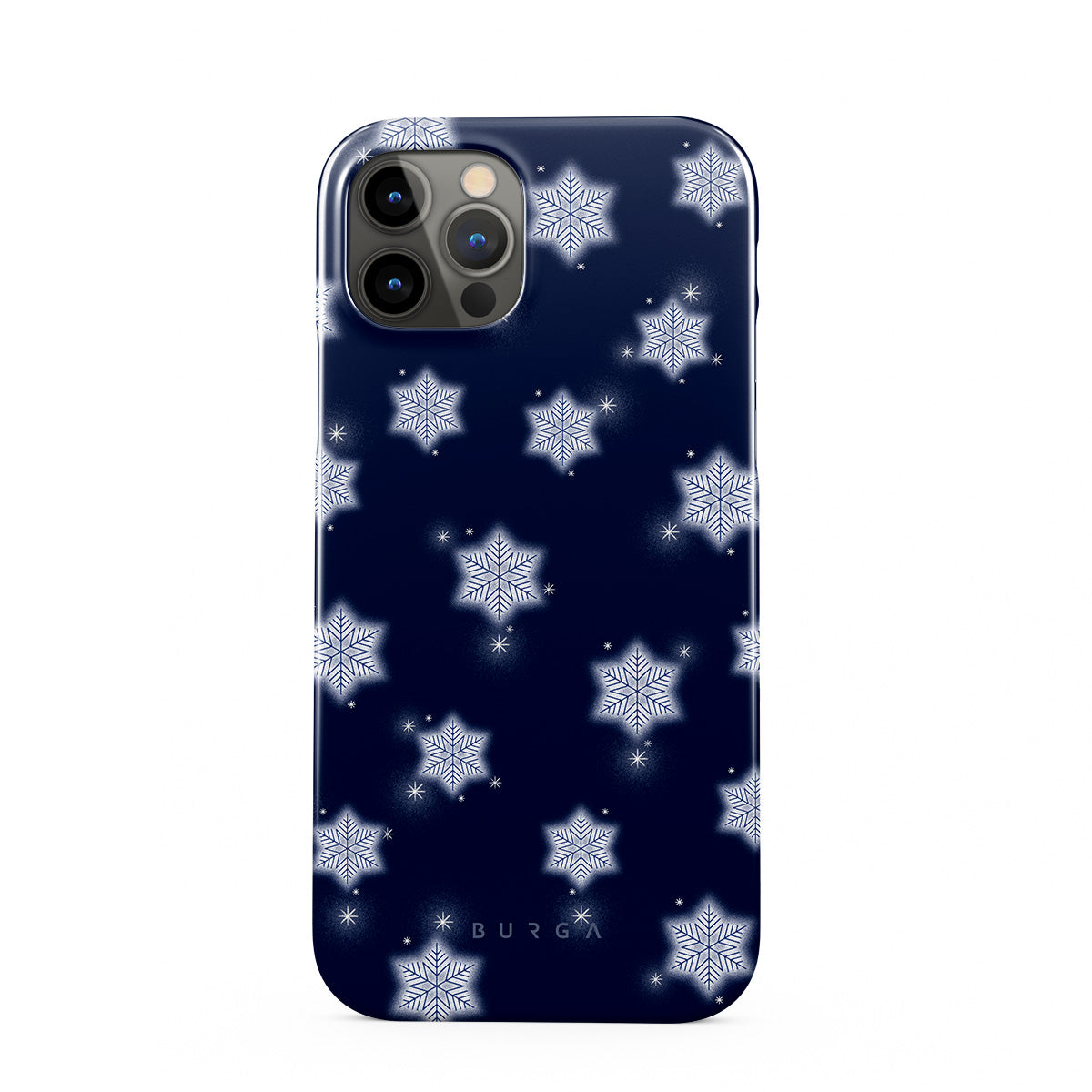 Główne elementy projektu: białe płatki śniegu, granatowe tło, zimowy wzór płatków śniegu, geometryczne płatki śniegu, klasyczny zimowy design