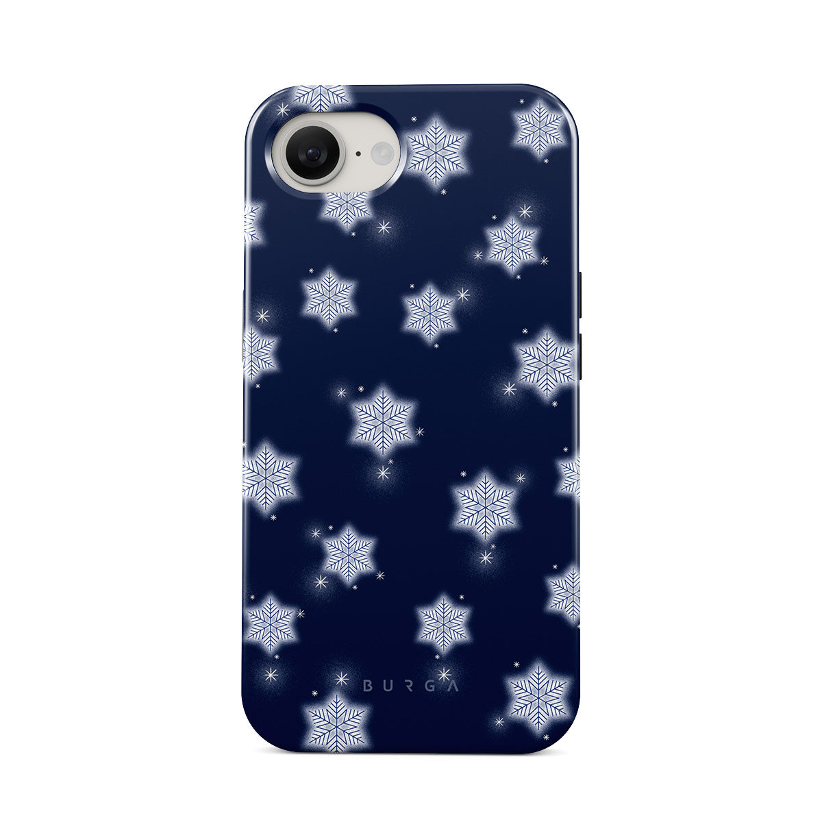 Główne elementy projektu: białe płatki śniegu, granatowe tło, zimowy wzór płatków śniegu, geometryczne płatki śniegu, klasyczny zimowy design