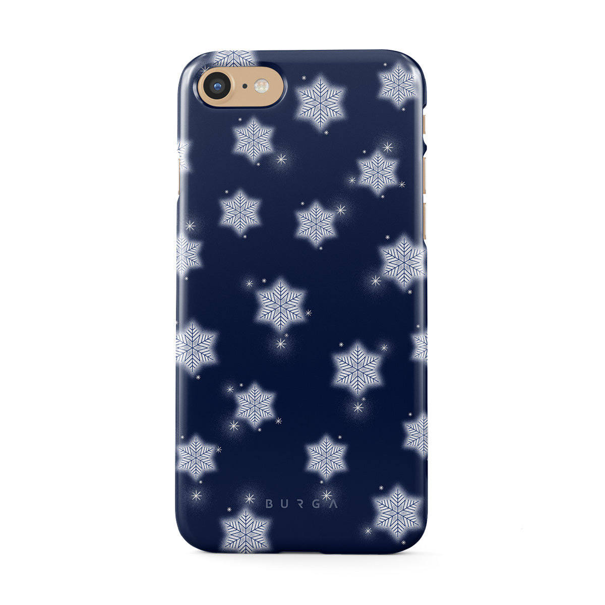 Główne elementy projektu: białe płatki śniegu, granatowe tło, zimowy wzór płatków śniegu, geometryczne płatki śniegu, klasyczny zimowy design