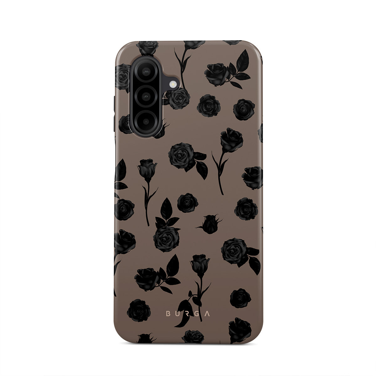 Główne elementy projektu: czarne róże, kolory ziemi, kwiatowe detale, ciemne kwiaty.