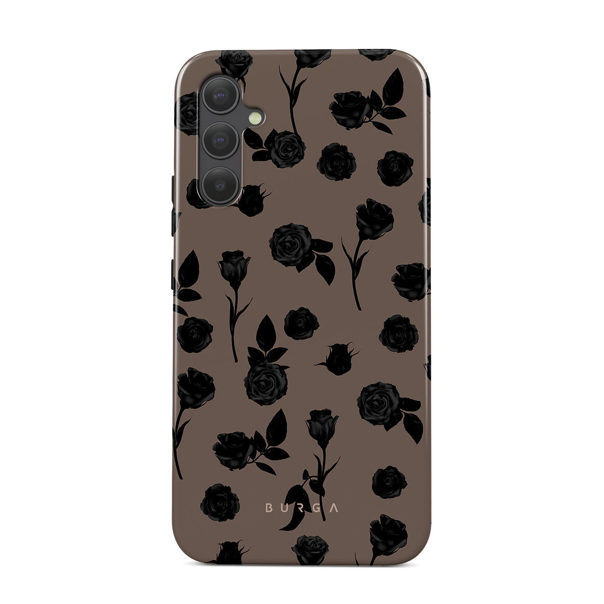 Główne elementy projektu: czarne róże, kolory ziemi, kwiatowe detale, ciemne kwiaty.