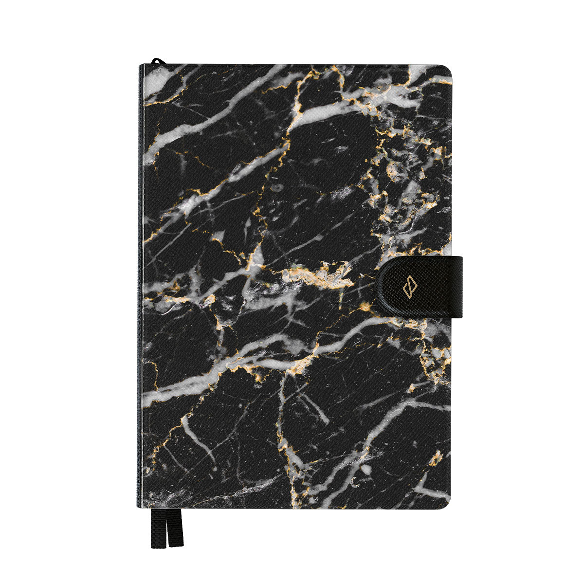 Wykończony piękną, wegańską skórą Saffiano, zabezpieczony eleganckim zapięciem magnetycznym i wystarczająco trwały, by poradzić sobie z rozlaną kawą oraz momentami, w których chciałoby się powiedzieć „ups”.