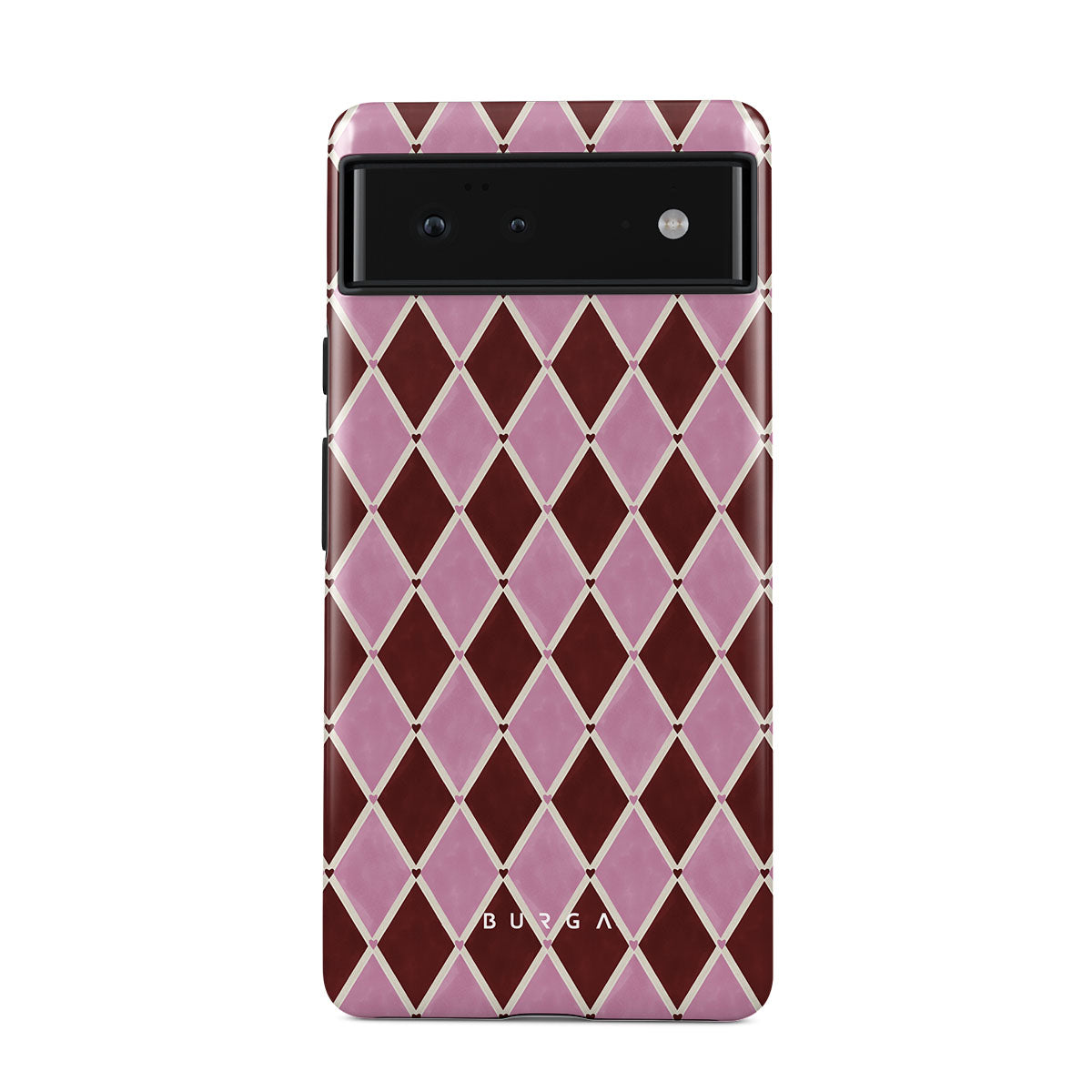 Główne elementy projektu: wzór arlekina, różowe romby, głębokie czerwone tło