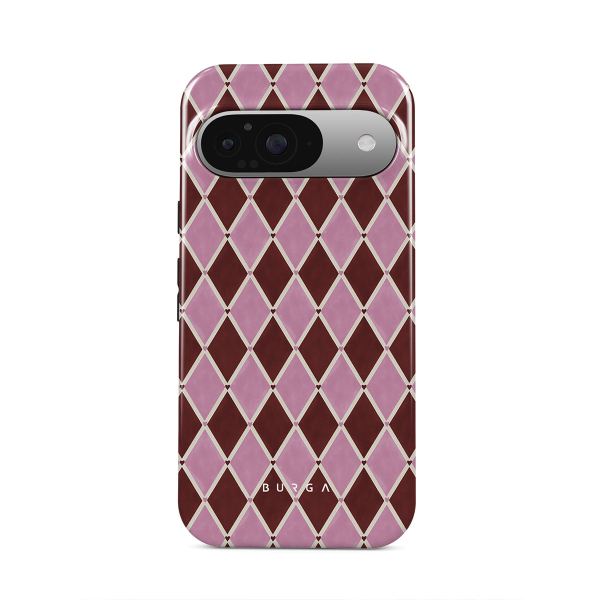 Główne elementy projektu: wzór arlekina, różowe romby, głębokie czerwone tło
