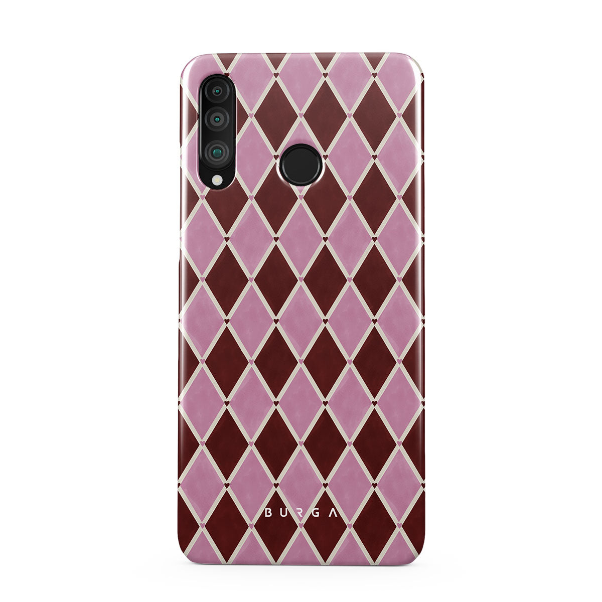 Główne elementy projektu: wzór arlekina, różowe romby, głębokie czerwone tło