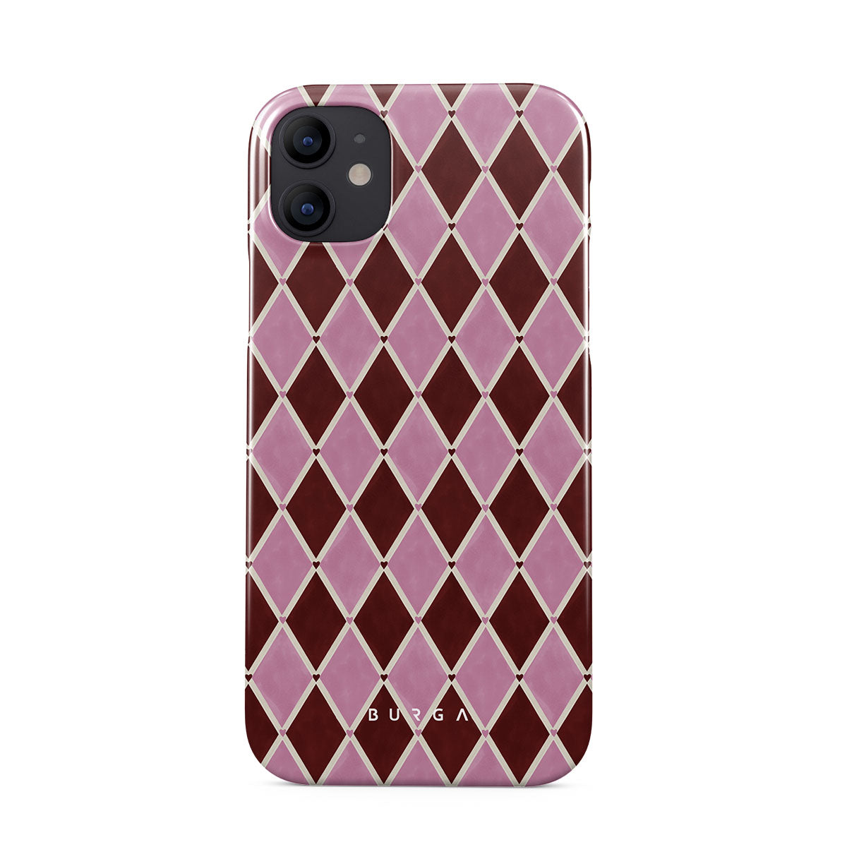 Główne elementy projektu: wzór arlekina, różowe romby, głębokie czerwone tło