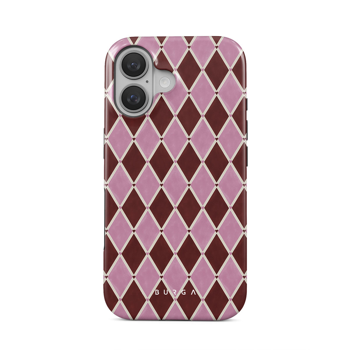 Główne elementy projektu: wzór arlekina, różowe romby, głębokie czerwone tło