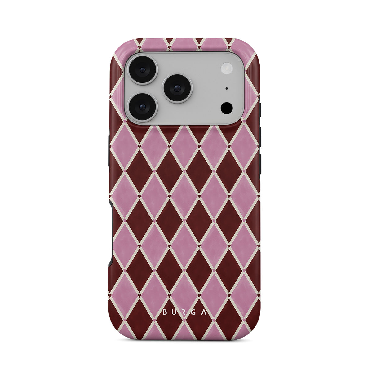 Główne elementy projektu: wzór arlekina, różowe romby, głębokie czerwone tło