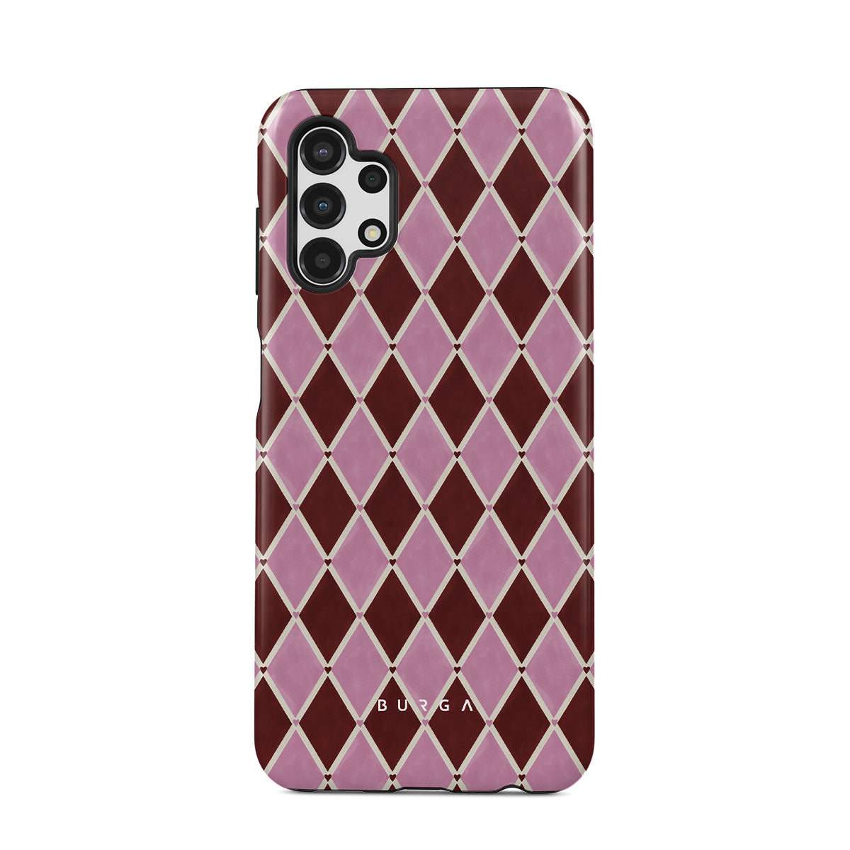Główne elementy projektu: wzór arlekina, różowe romby, głębokie czerwone tło