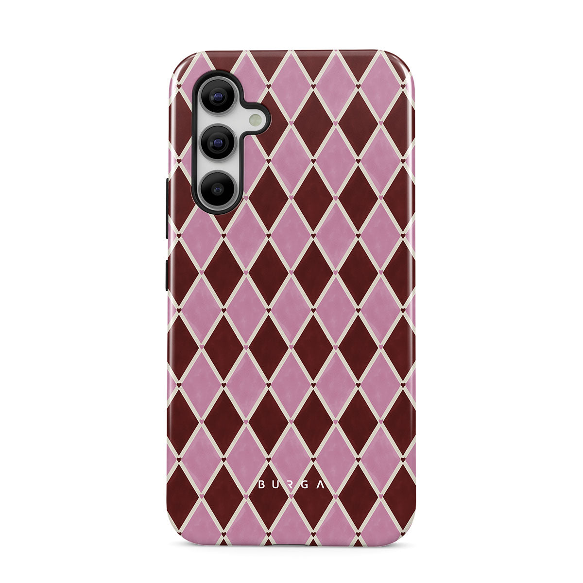 Główne elementy projektu: wzór arlekina, różowe romby, głębokie czerwone tło