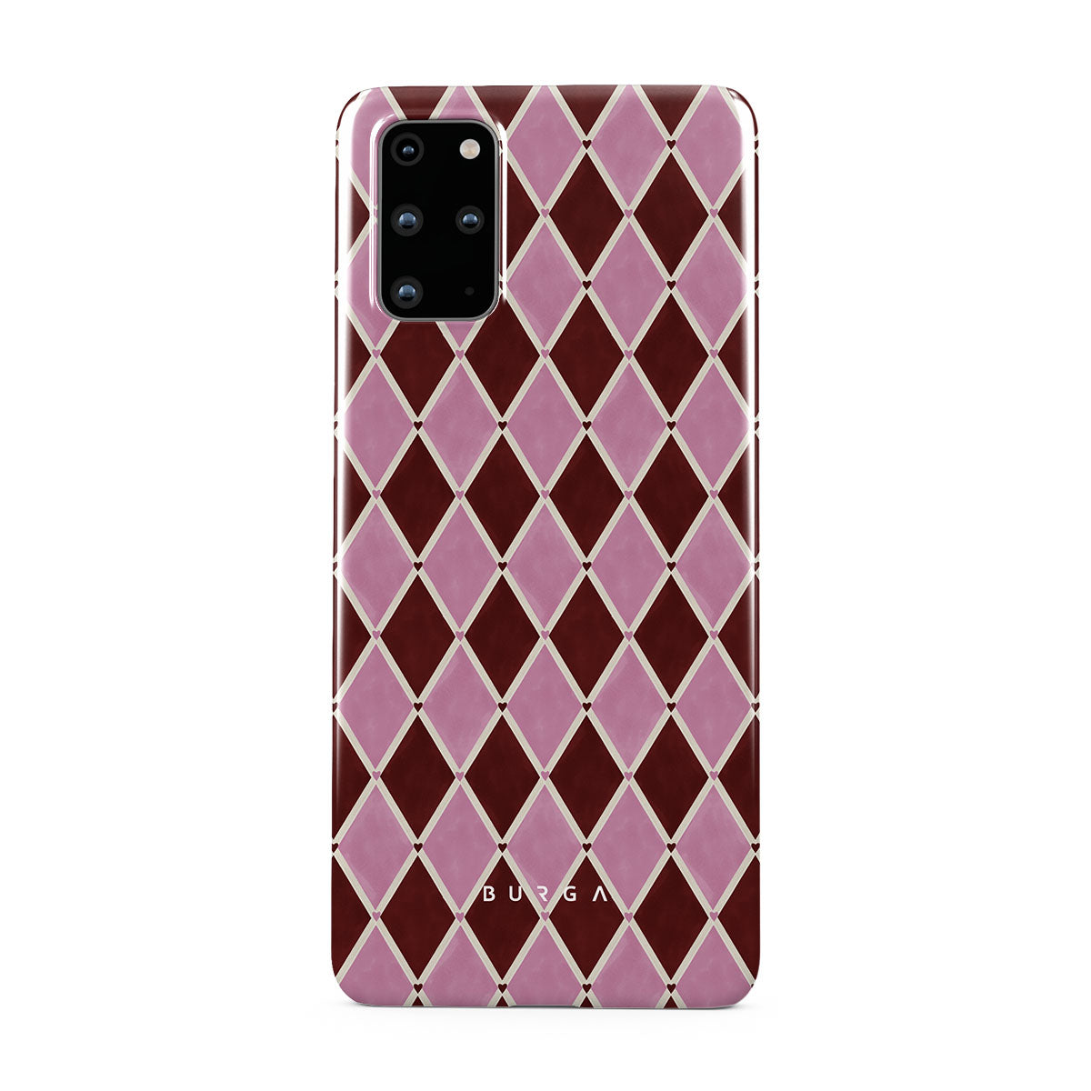 Główne elementy projektu: wzór arlekina, różowe romby, głębokie czerwone tło