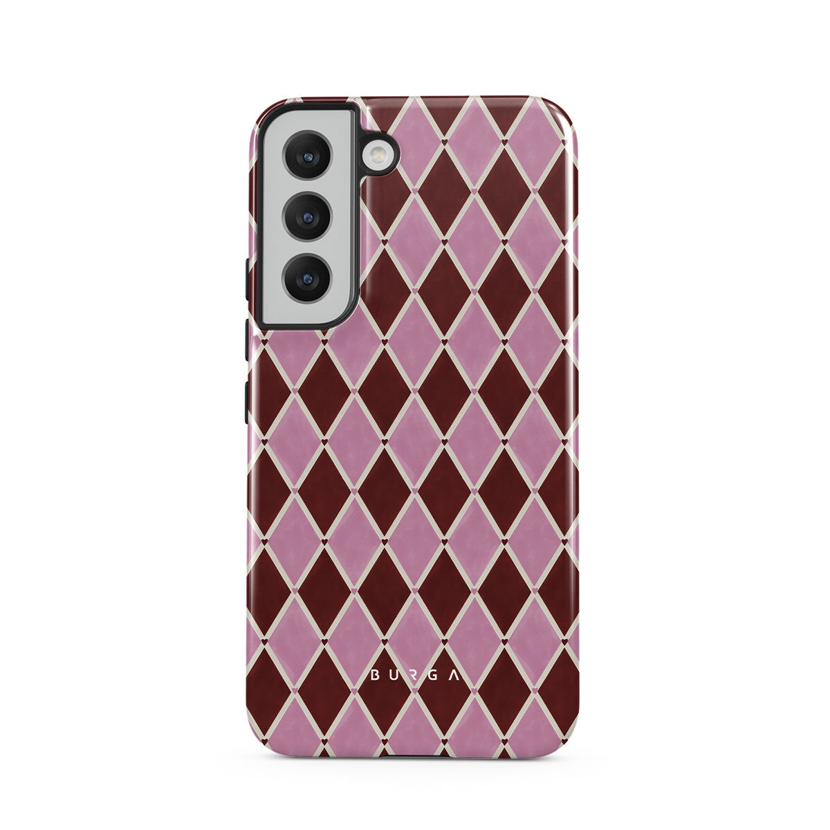 Główne elementy projektu: wzór arlekina, różowe romby, głębokie czerwone tło