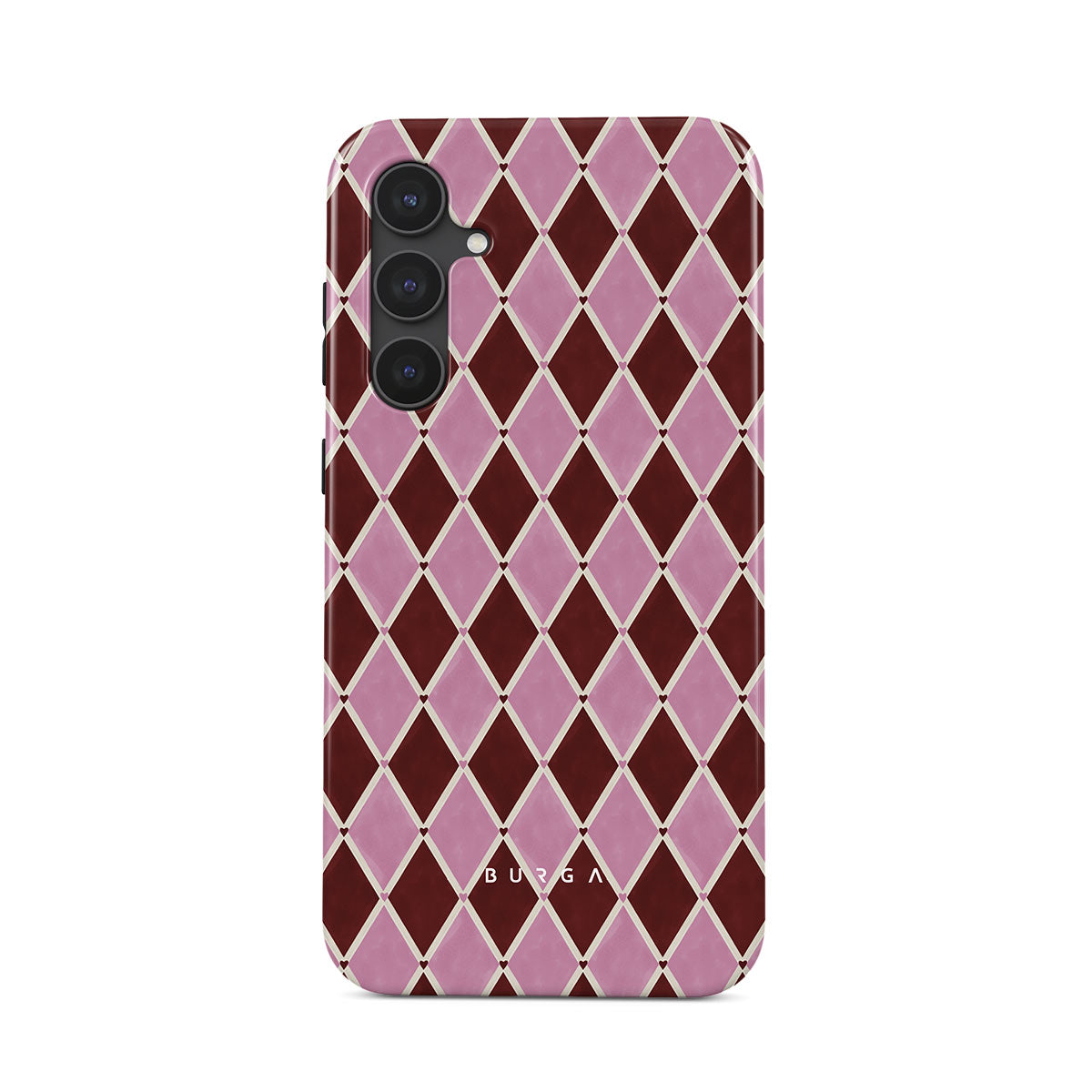 Główne elementy projektu: wzór arlekina, różowe romby, głębokie czerwone tło
