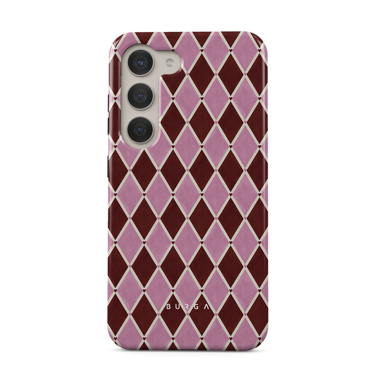 Główne elementy projektu: wzór arlekina, różowe romby, głębokie czerwone tło