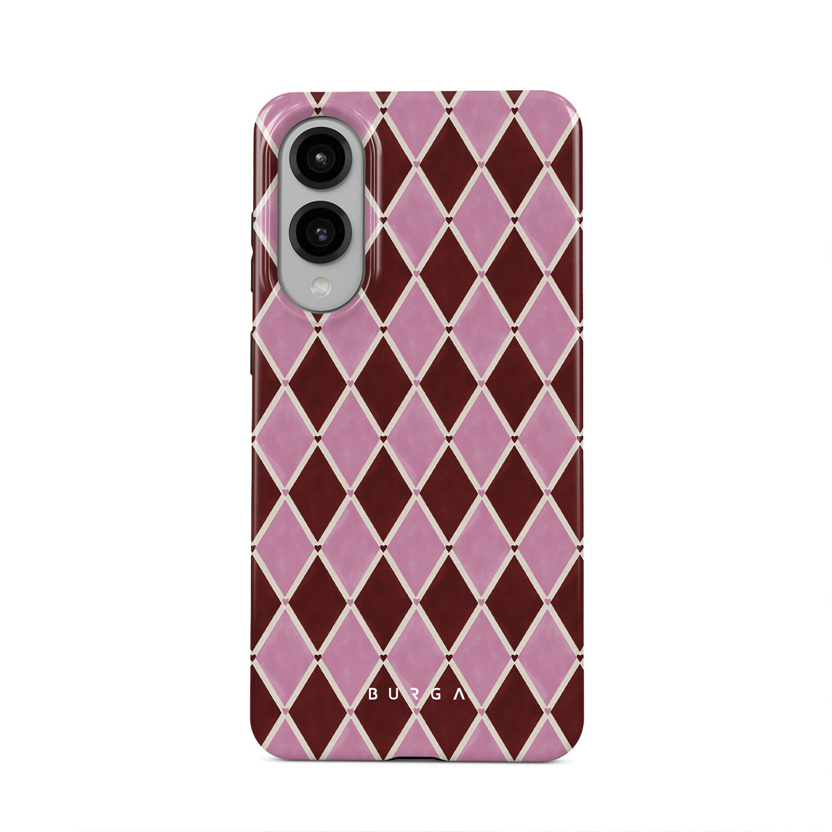 Główne elementy projektu: wzór arlekina, różowe romby, głębokie czerwone tło