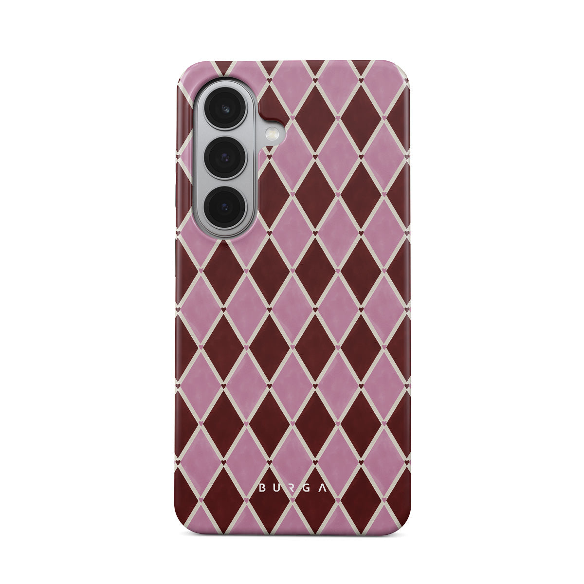 Główne elementy projektu: wzór arlekina, różowe romby, głębokie czerwone tło