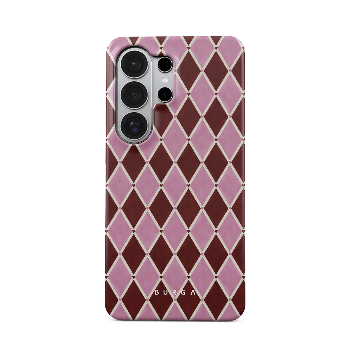 Główne elementy projektu: wzór arlekina, różowe romby, głębokie czerwone tło