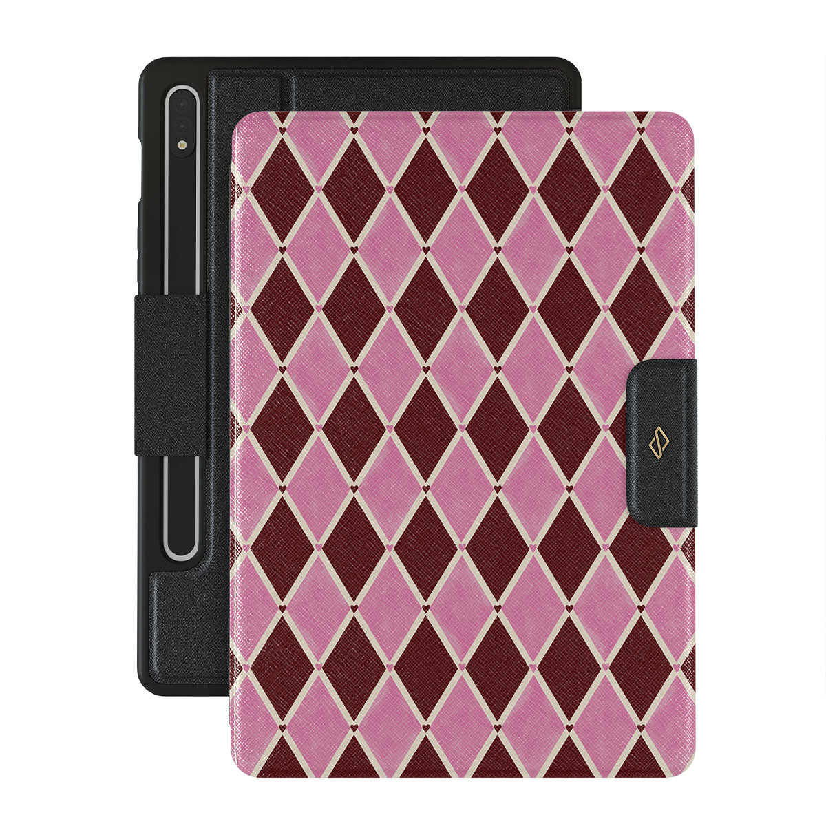 Główne elementy projektu: wzór arlekina, różowe romby, głębokie czerwone tło