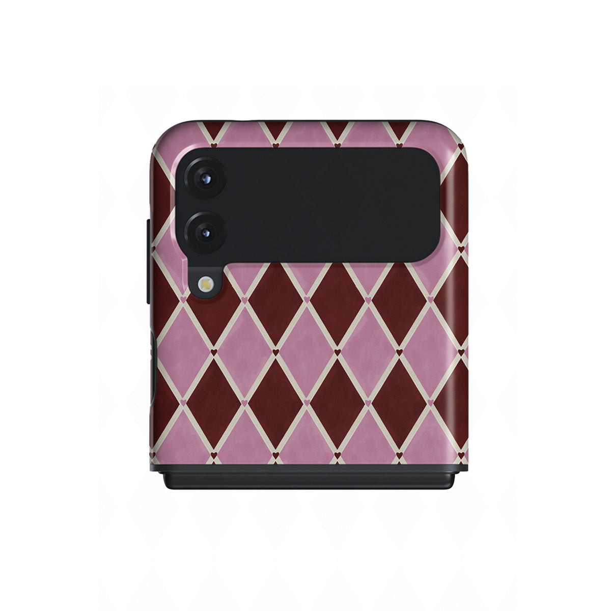 Główne elementy projektu: wzór arlekina, różowe romby, głębokie czerwone tło