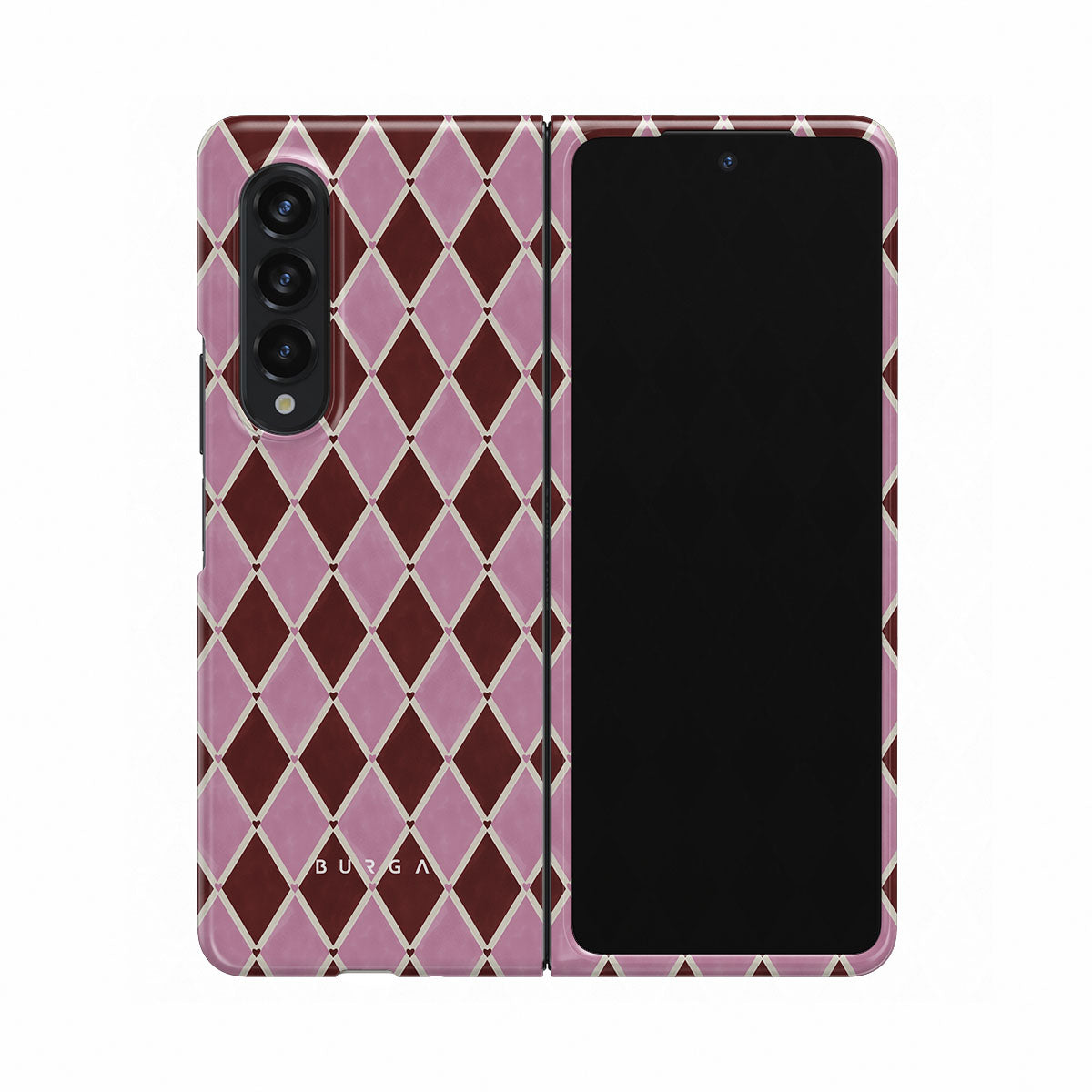 Główne elementy projektu: wzór arlekina, różowe romby, głębokie czerwone tło