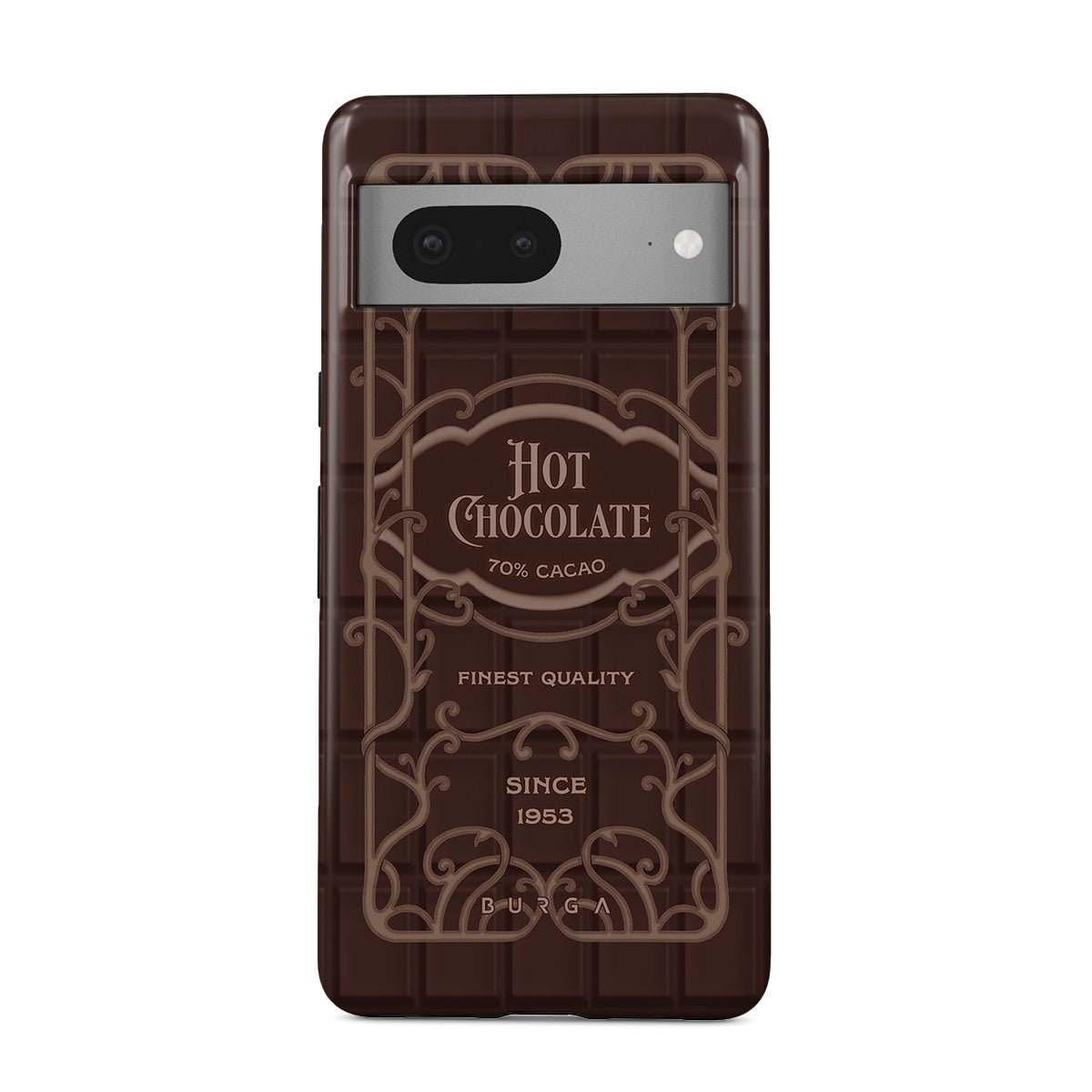 Główne elementy projektu: etykieta gorącej czekolady, brązowy design czekolady, retro styl opakowania