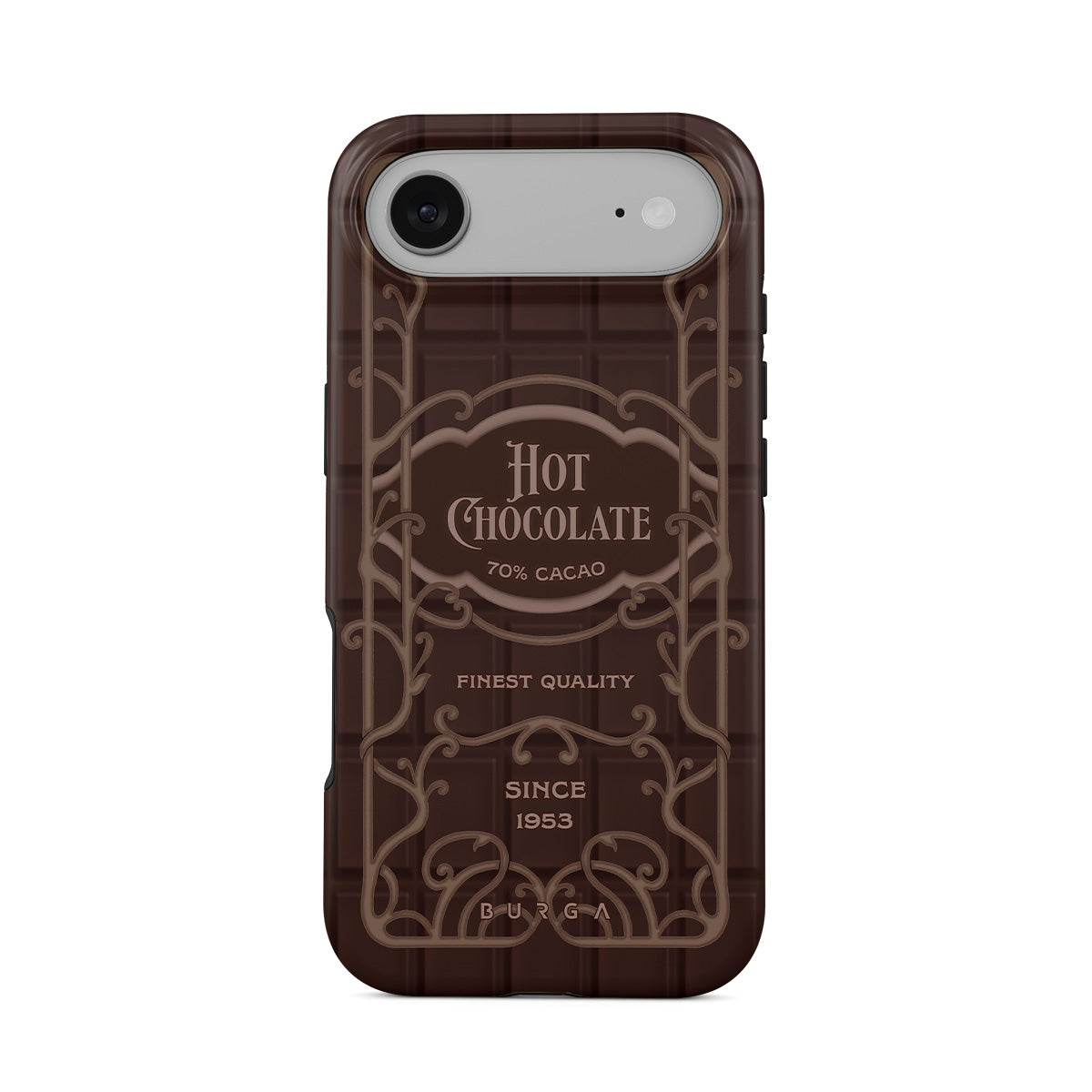 Główne elementy projektu: etykieta gorącej czekolady, brązowy design czekolady, retro styl opakowania