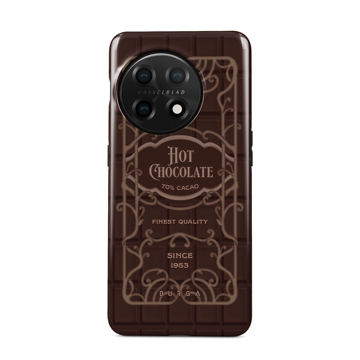 Główne elementy projektu: etykieta gorącej czekolady, brązowy design czekolady, retro styl opakowania