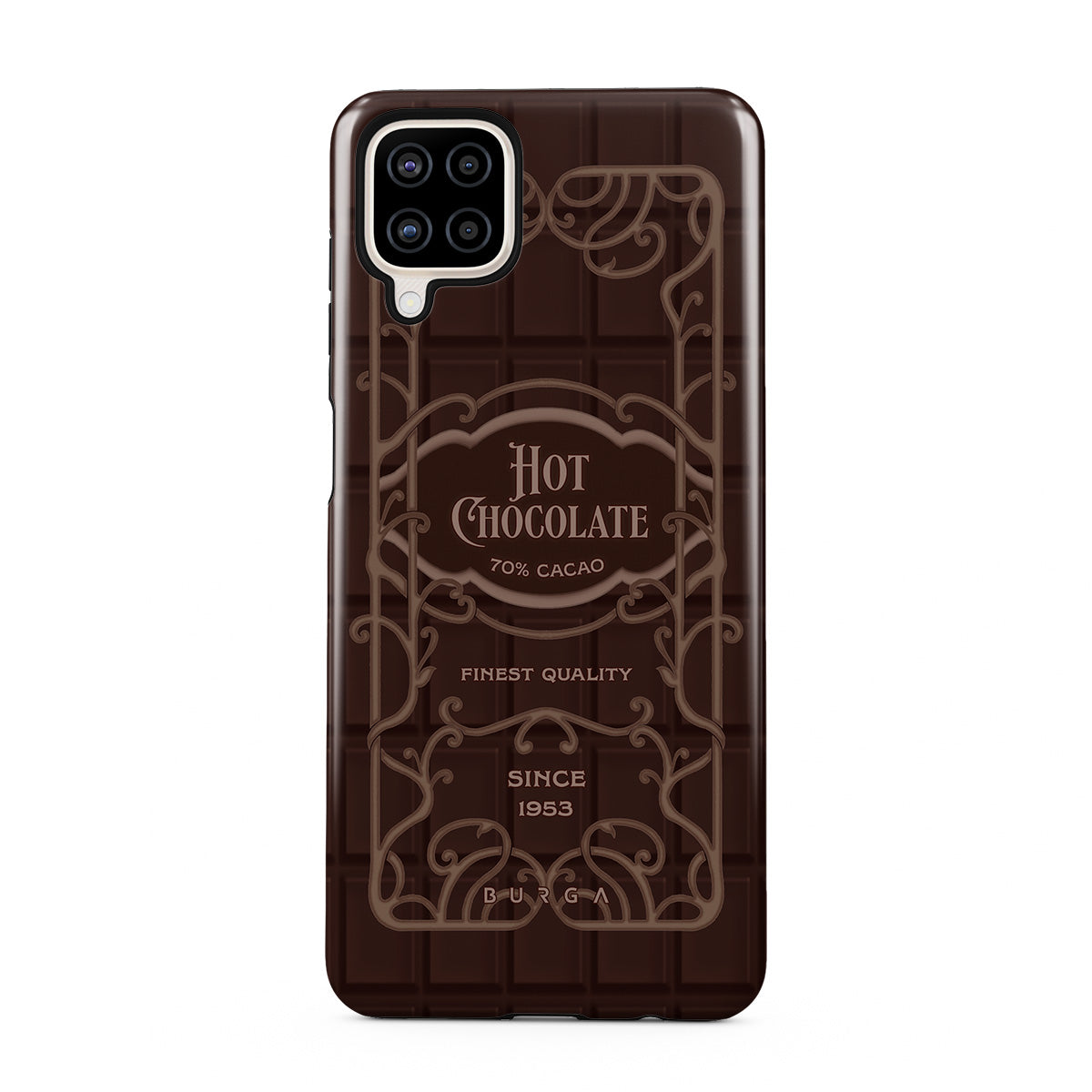Główne elementy projektu: etykieta gorącej czekolady, brązowy design czekolady, retro styl opakowania