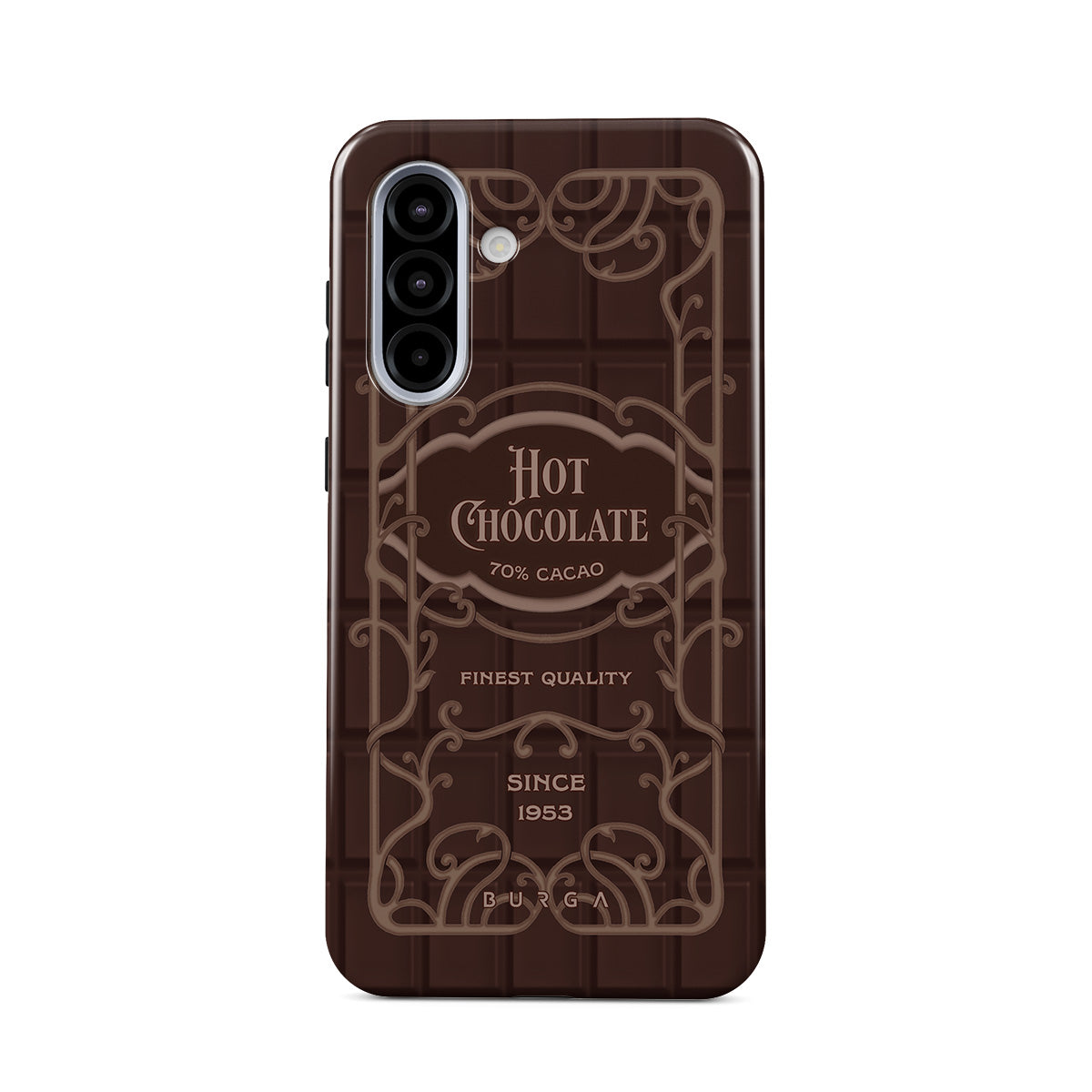 Główne elementy projektu: etykieta gorącej czekolady, brązowy design czekolady, retro styl opakowania