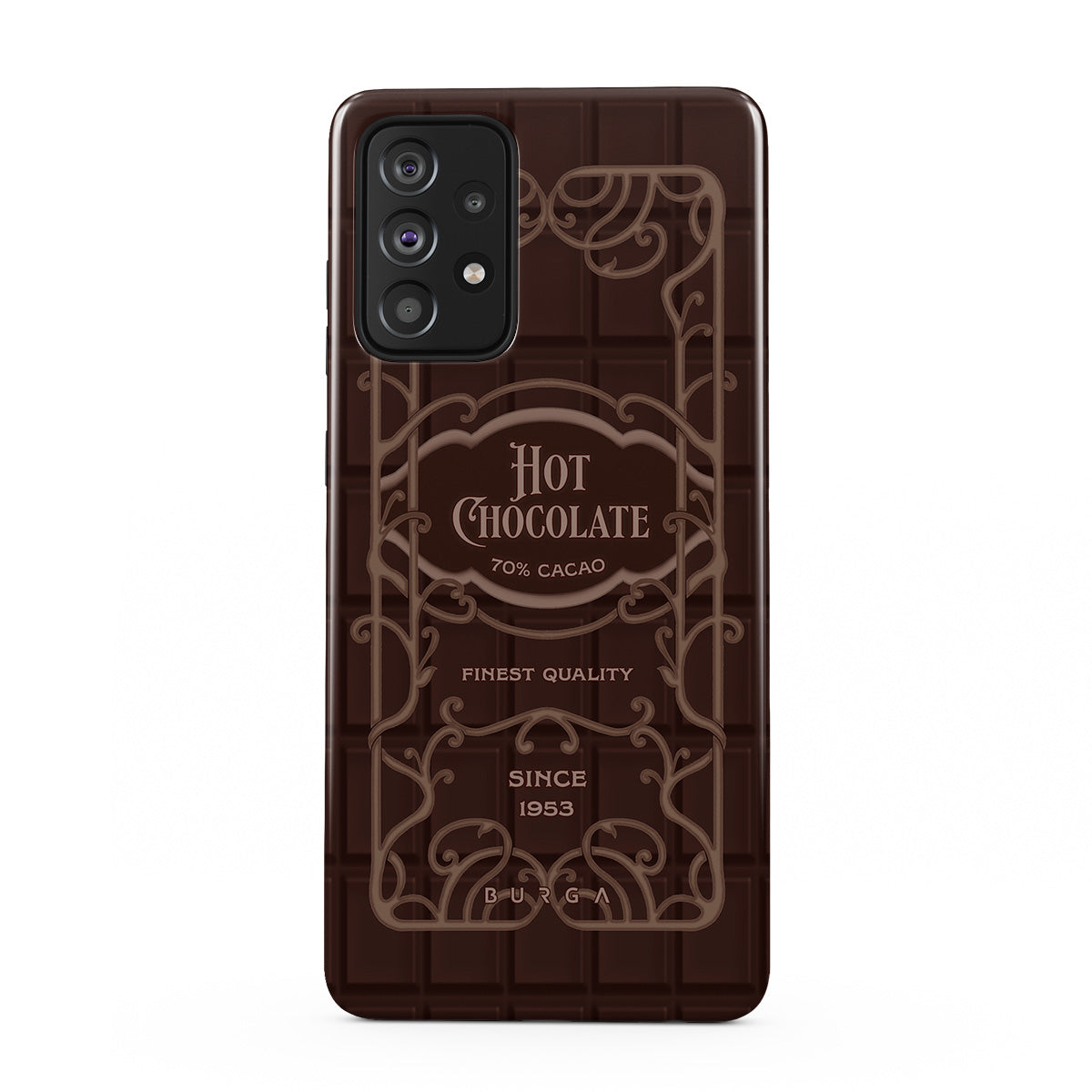 Główne elementy projektu: etykieta gorącej czekolady, brązowy design czekolady, retro styl opakowania