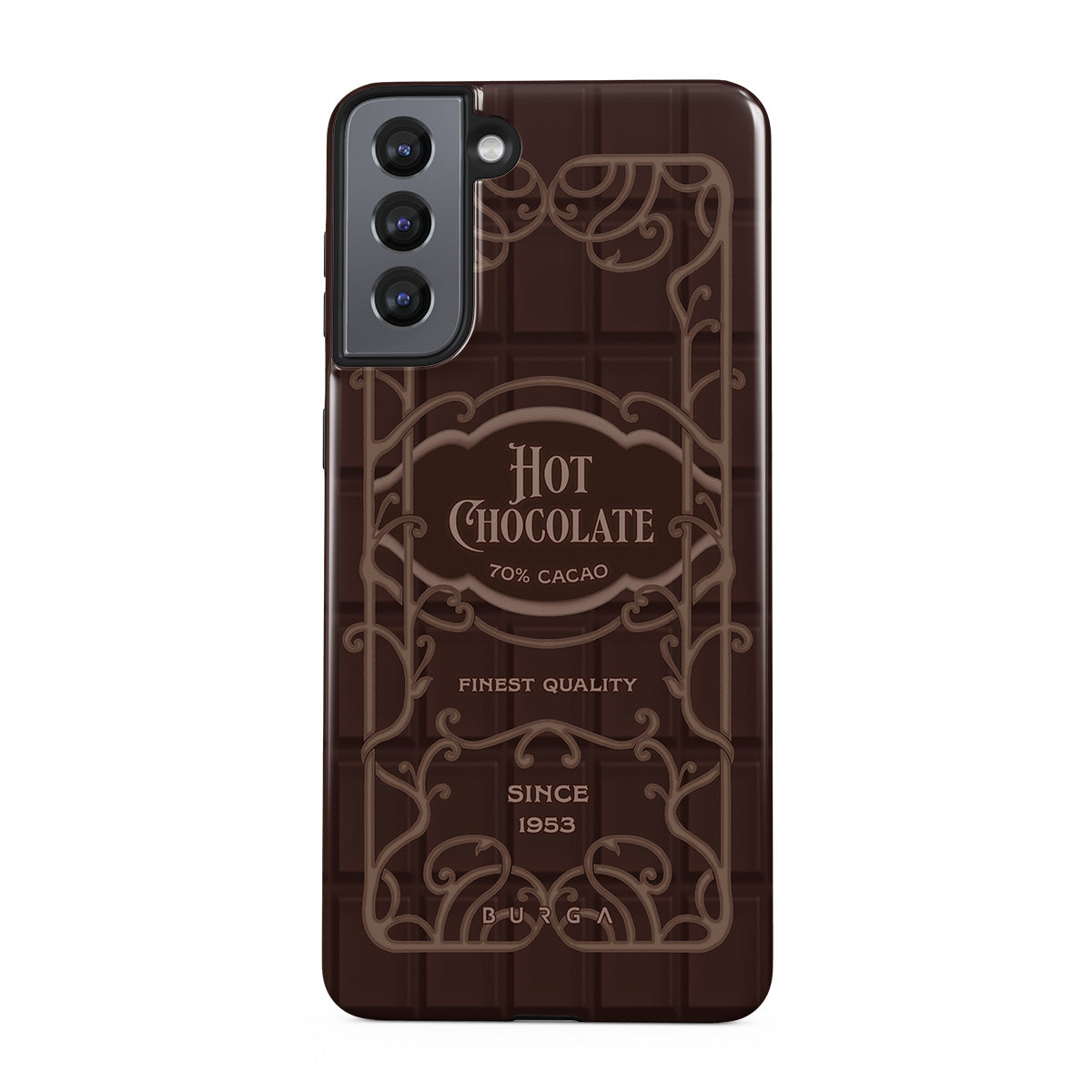Główne elementy projektu: etykieta gorącej czekolady, brązowy design czekolady, retro styl opakowania